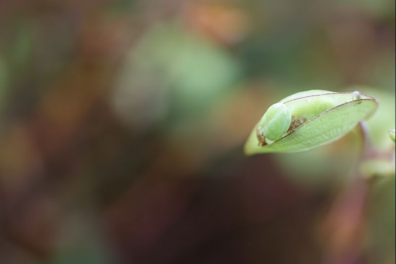 葉っぱの先に、みどりの小さな命がちょこんと乗って、「みゅ~ん」って音だけが風にのびていくみたいだった。